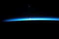 "The International Space Station basking in blue Earthshine as the rising sun pierces our razor-thin atmosphere