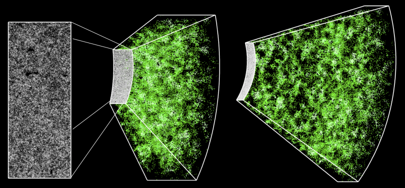 This is a section of the 3-dimensional map. The rectangle on the left shows a cut-out of 1000 square degrees in the sky containing nearly 120,000 galaxies.